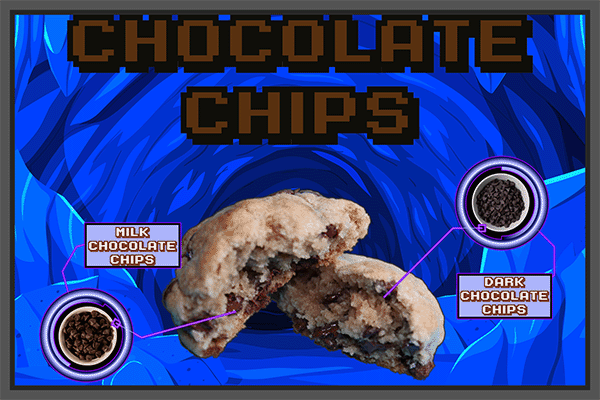 Milk and Dark Chocolate Chips in a vanilla cookie base.